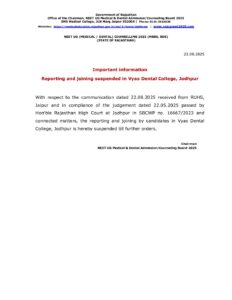 important information 23.08.2025 Reporting and joining suspended in Vyas Dental College, JodhpurBy larn_mbbs_useradmin / August 25, 2025